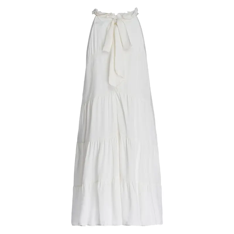 This dress has a beautiful off-the-shoulder design that exudes effortless charm and femininity. The delicate bow halterneck adds a touch of romance and glamor, while the sleeveless silhouette is perfect for warmer weather. The crisp white color of the dress is reminiscent of the pristine beaches of the French Riviera, making it ideal for a resort-inspired look.