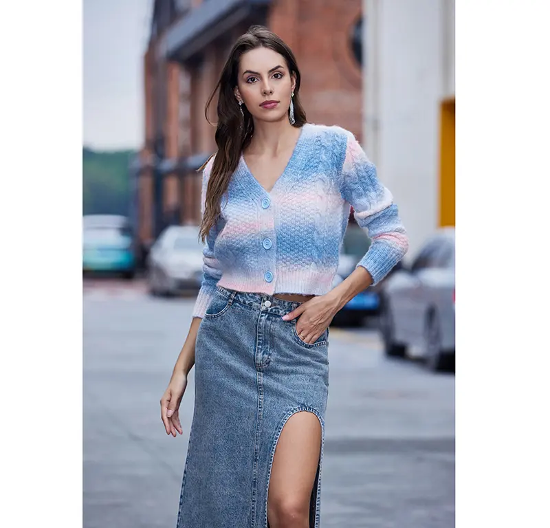 This Women's Elegant Cropped Blue and Pink Casual Long Sleeve Versatile Cardigan is a timeless and sophisticated addition to any woman's wardrobe. Its effortless style and versatility make it a must-have that can be worn year-round. Whether you're looking for a cozy layering piece or a statement sweater, this cardigan has you covered.